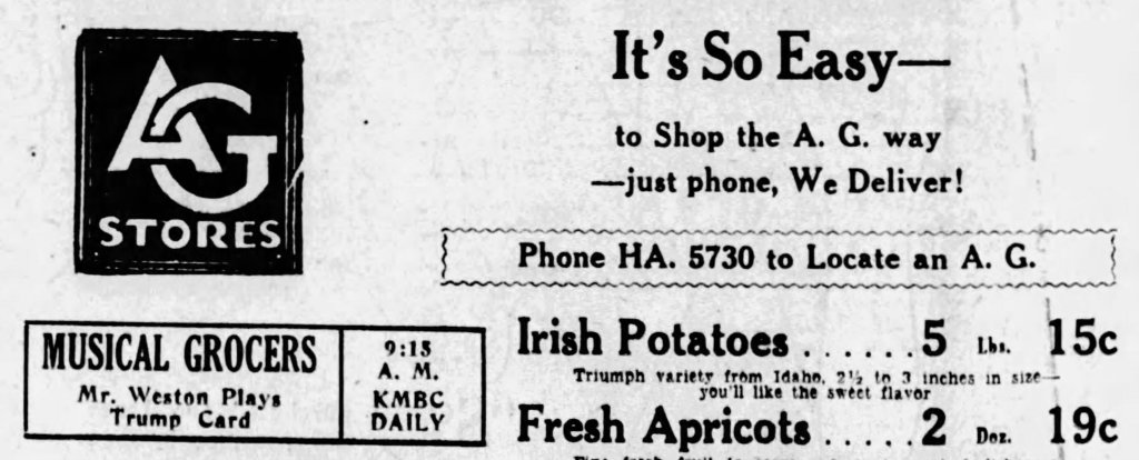 A-G Musical Grocers Ad, July 6, 1934 On July 13, 2024May 29, 2024 By Ryan EllettIn UncategorizedLeave a comment