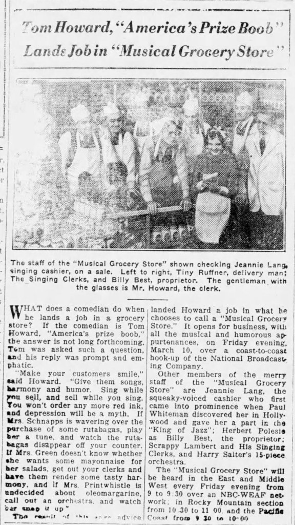 Musical Grocery Store, March 1933 On July 19, 2024May 29, 2024 By Ryan EllettIn A.G. Musical Grocers, Billy Best, Harry Salter, Jeannie Lang, KMBC, Musical Grocery Store (NBC), Singing Clerks, The, Tiny Ruffner, Tom HowardLeave a comment A similarly-named predecessor to KMBC’s A-G Musical Grocers: